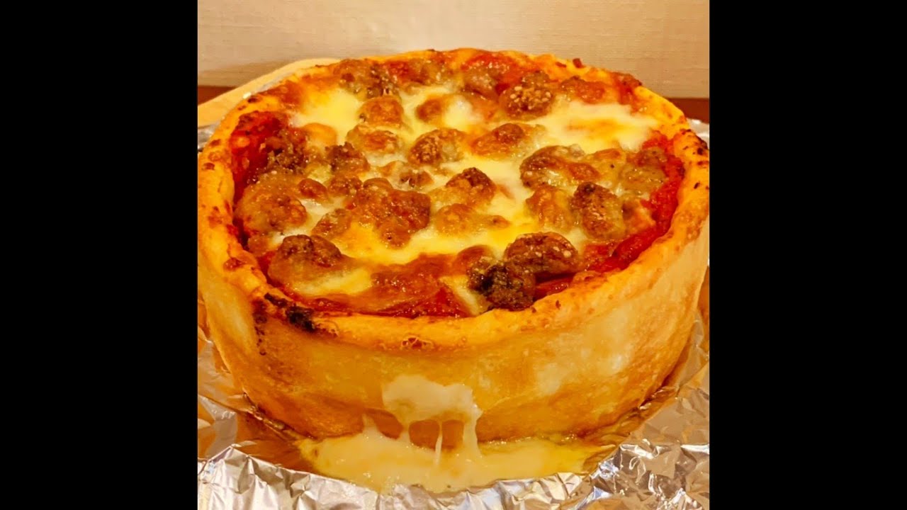 シカゴピザは、キッシュのように高さのあるクリスピーな生地に、お肉、野菜、チーズ、トマトソースなどの具材が詰まったボリューム満点のピザ。